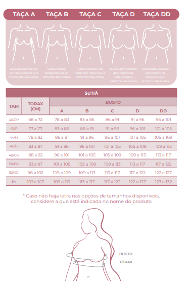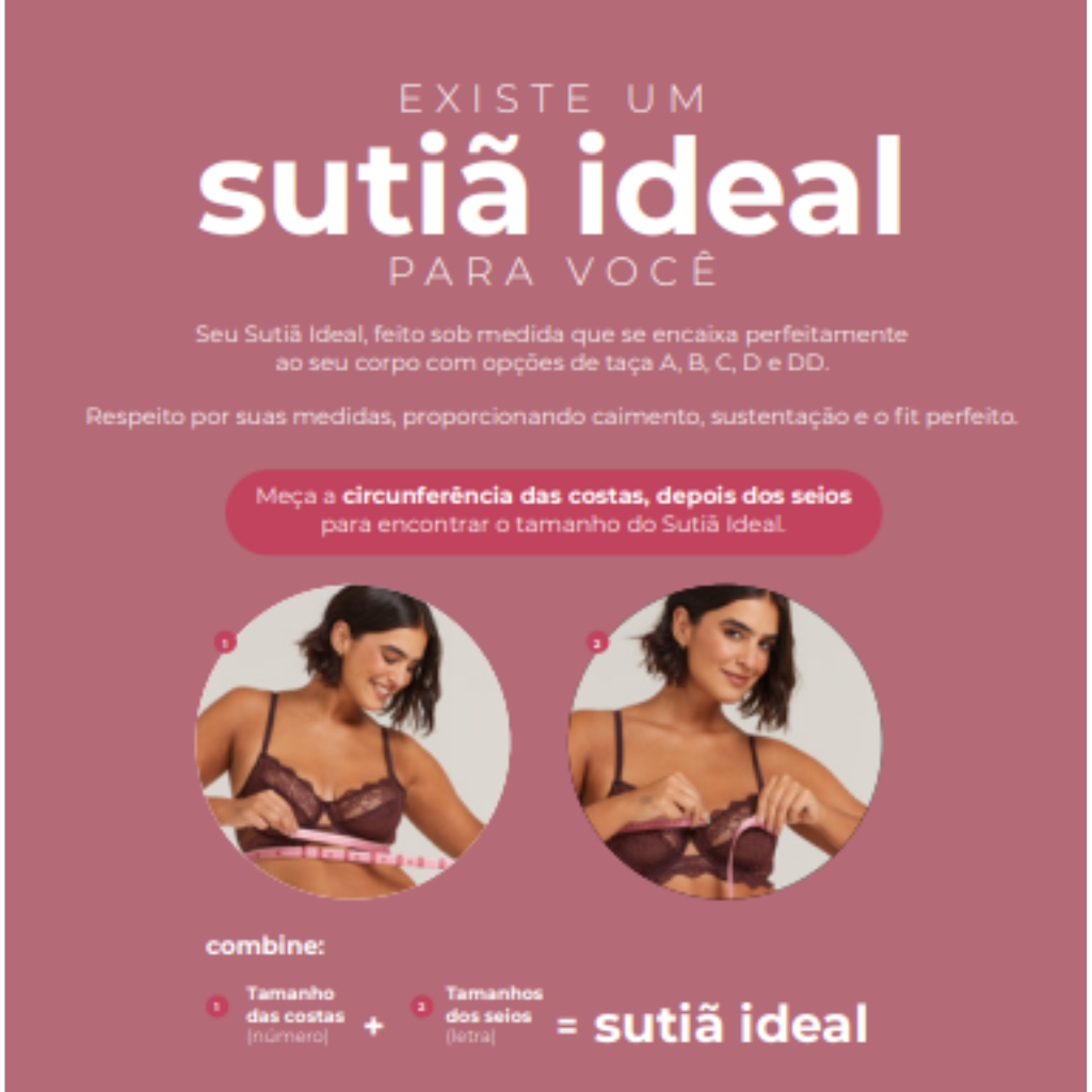 Com modelos que atendem das taças A à DD, a linha oferece variações que equilibram corretamente a base do sutiã com o volume do busto, evitando apertos, folgas ou falta de sustentação. O resultado são peças que acompanham seus movimentos, valorizam a silhueta e fazem você se sentir segura em todos os momentos.