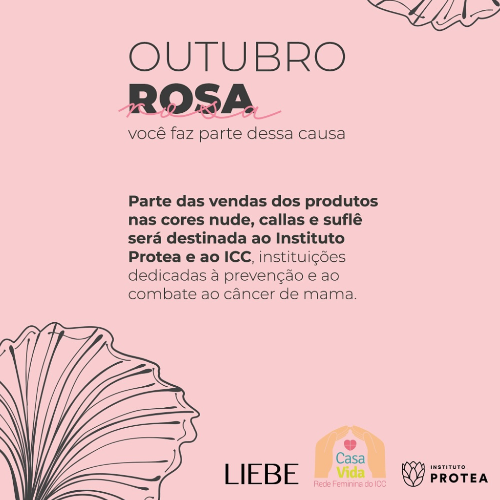 Na Liebe, acreditamos que a moda íntima vai muito além da estética — ela também pode ser uma forma de cuidado, amor-próprio e solidariedade. Por isso, durante todo o mês de outubro, parte das vendas das lingeries nas cores Suflê, Callas e Nude será destinada ao @institutoprotea e à @casavidaicc, instituições que realizam um trabalho essencial no apoio ao tratamento e acolhimento de mulheres em diferentes fases da luta contra o câncer de mama.